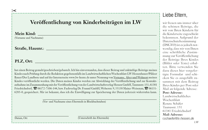 Wenn ihr uns eure Beiträge für das Landwirtschaftliche Wochenblatt und/oder unsere Internetseite www.lw-heute.de zur Veröffentlichung zuschicken möchtet, bittet eure Eltern, dass sie dieses kleine Formular hier für euch ausfüllen und mitschicken!