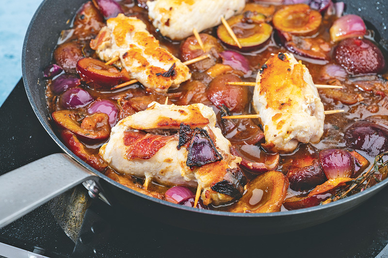 Pflaumen waschen, trocken tupfen, entstielen, halbieren und entkernen. Zwiebeln schälen und vierteln. Knoblauch ebenfalls schälen und fein hacken. Die Hähnchenbrust der Länge nach halbieren, mit Frischhaltefolie bedecken und mit einem Fleischklopfer oder Nudelholz flach klopfen. Mit Schinken belegen und frisch geriebenem Parmesan bestreuen. Anschließend das Fleisch aufrollen und mit einem Zahnstocher fixieren. Mit Salz und Pfeffer würzen und in Mehl wenden. Olivenöl in einer Pfanne erhitzen. Zwiebeln und Knoblauch darin anbraten, dann die Involtini rundherum 2 Minuten scharf anbraten. Pflaumen, Zitronenschale und Thymian hinzufügen, kurz mitbraten und mit Brühe ablöschen. Die Pflaumen etwa 8 bis 10 Minuten einkochen lassen, dabei die Involtini regelmäßig mit dem Ragout begießen.