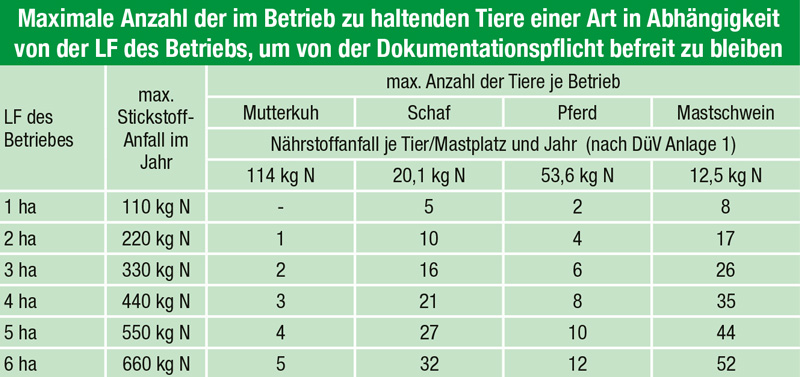 Betriebe, die Tiere halten und unter 6,8 ha LF bewirtschaften, können davon betroffen sein. Denn als Befreiungsgrenze gilt außerhalb der gefährdeten Gebiete nicht mehr die alte Regel (weniger als 750 kg N pro Jahr aus der Tierhaltung), sondern: weniger als 110 kg N-Anfall/ha und Jahr aus der Tierhaltung. Diese 6,8 ha-Grenze folgt daraus, dass Betriebe, die die maximal zulässige Menge des N-Anfalls in Höhe von 110 kg N/ha/a vollständig ausschöpfen, ab diesem Flächenumfang die bisherige zulässige Obergrenze von 750 kg N-Anfall pro Jahr erreichen. Oder anders formuliert: Wer bisher den Grenzwert von 750 kg fast ausgeschöpft hat, muss nun mindestens 6,8 ha bewirtschaften, um weiterhin befreit zu sein.Bisher war zum Beispiel ein Betrieb, der 6 ha LF bewirtschaftet und sechs Mutterkühe oder 36 Mutterschafe oder 13 Pferde hält, von der Dokumentationspflicht befreit, muss nun aber nach der neuen Regel dokumentieren. Eine Übersicht, bei welcher Flächenausstattung welche Tierzahl möglich ist, ohne dokumentationspflichtig zu werden, ist in der Tabelle dargestellt. Für eine exakte Berechnung sollten die Tabellenwerte aus der Düngeverordnung, Anhang 1, Tabelle 1 „Nährstoffausscheidungen landwirtschaftlicher Nutztiere“, eingesetzt werden.
