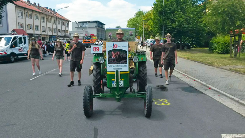 Am vergangenen Sonntag ist der Hessentag 2017 in Rüsselsheim am Main mit dem Festumzug als Höhepunkt und Abschluss des zehntägigen Landesfestes erfolgreich zu Ende gegangen. Auch Landwirte beteiligten sich am Umzug. Unser Bild zeigt die „Feldhamsterfreunde Bruchköbel-Roßdorf“ mit den Landwirten Heiko Fechner und Axel Lind, die für ein FeldhamsterÂproÂjekt in der Region werben. Nach Angaben des BUND zählt der westliÂche Main-Kinzig-Kreis von Bruchköbel bis an den Rand von Frankfurt-Bergen-Enkheim mit 5 000 ha zum größten Feldhamstergebiet in Hessen. Landwirte, die am Projekt teilnehmen, erhalten einen Ausgleich. FeldhamÂsÂter sind mittlerweile „Freunde“ der Landwirte geworden. Denn werden ihre Baue gesichÂtet, darf oftmals auf dem Feld nicht gebaut werden und der Acker bleibt der Landwirtschaft erhalten.