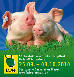 Das Landwirtschaftliche Hauptfest findet im vierjährigen Turnus statt – und zwar im Jahr ohne Agritechnica und abwechselnd mit dem Zentralen Landwirtschaftsfest in München – und stellt mit rund 600 Firmen dem Fachpublikum Anbieter im vor- und nachgelagerten Agrarbereich vor. VeranstalÂter ist der LandesbauÂernverband BaÂden-Württemberg. Mit vielen Infoveranstaltungen und einem UnterÂhaltungsprogramm wird die moderne LandÂwirtschaft vorgestellt. Das Hauptfest gilt als die größte südÂdeutsche Fachausstellung für Land- und Forstwirtschaft und wird durch Fachvorträge, Vorführungen, Tier- und SonderschauÂen ergänzt. Bäuerinnen und Bauern informieren beim diesjährigen Hauptfest über ihre Betriebe und Firmen sowie über neue Produkte und Dienstleistungen. In der AußenÂtechnik sind insbesondere Hersteller von Großmaschinen vor Ort. Ebenso nehÂmen zahlreiche AusstelÂler aus der Innentechnik, dem Stallbau, der Einrichtungstechnik und dem Zubehörbereich teil. Los geht es Samstag, 25. September, um 11 Uhr mit der Eröffnungsfeier an der Fruchtsäule. Die AusÂsteller aus Deutschland und dem benachbarten Ausland verwandeln den Wasen dann für eine Woche mit ihren Produkten und Maschinen, mit ihren Tieren und Dienstleistungen in den „größten Bauernhof“. In zwölf Zelthallen und auf 50 000 Quadratmeter Freifläche gibt es für Fachbesucher wie auch für Verbraucher viel zu sehen. Im Mittelpunkt steht insbesondere der Wandel in der Landwirtschaft. TechnoÂlogische Weiterentwicklungen im Bereich der Tierhaltung oder neuartige Steuerungs- und Regeltechniken beim MaÂschiÂÂneneinsatz sollen die Qualität und Effizienz der Arbeit steigern. Auch nachwachsende Rohstoffe oder die Energiegewinnung aus Biogas spielen eine immer bedeutendere Rolle für den landwirtschaftlichen Sektor. Täglich gibt es ein Nachmittagsprogramm mit PferdevorführunÂgen des Haupt- und Landgestüts Marbach sowie der PferÂdezuchtÂverbände. Ebenso lohnt sich der Besuch des „Größten Bauernhofes“ des Landes Baden-Württemberg auf dem Wasen. Gemeinsame Busfahrten zum Landwirtschaftlichen Hauptfest 2010 nach Stuttgart organisieren aus dem LW Gebiet auch einige Vereine landwirtschaftlicher Fachschulabsolventen.Tipps für Hauptfest-Termine