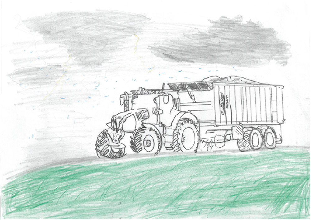 Dieses tolle Kunstwerk hat uns Joel (9 Jahre) aus Gechingen zugeschickt. Es zeigt einen Claas Axion 830 Cmatic mit einem Anhänger von Fliegl (Gigant ASW 271).