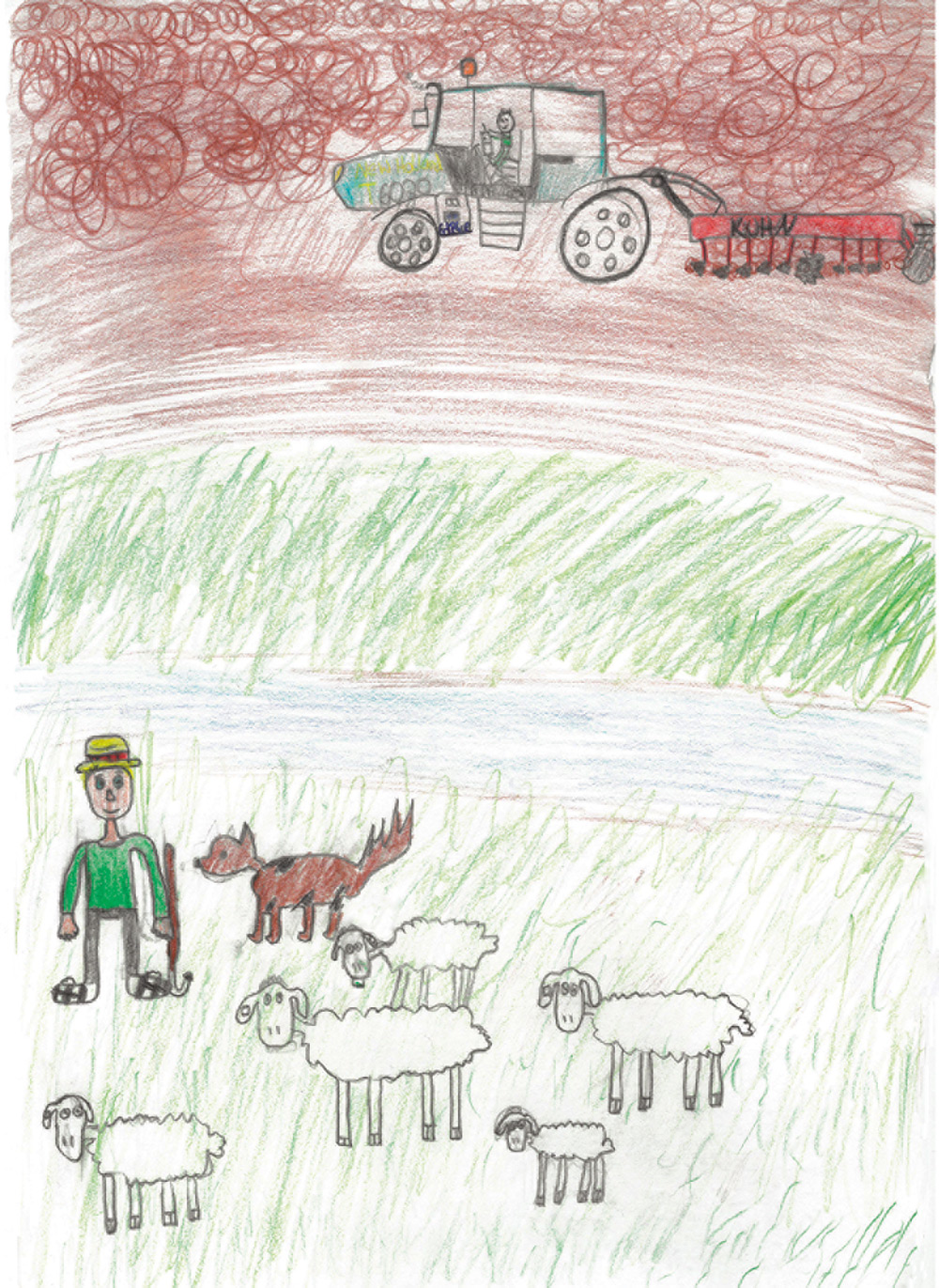 Ganz toll gelungen ist auch dieses schöne Bild. Jason (12 Jahre) aus Steinau hat es für die Kinderseite gemalt. Oben im Bild seht ihr Jasons Opa Heinrich bei der Arbeit auf dem Feld mit einem Schlepper von New Holland und einer Scheibenegge von Kuhn. Unten im Bild ist Jasons Uropa Heinrich beim Schafehüten mit seinem Hütehund Perle zu sehen.