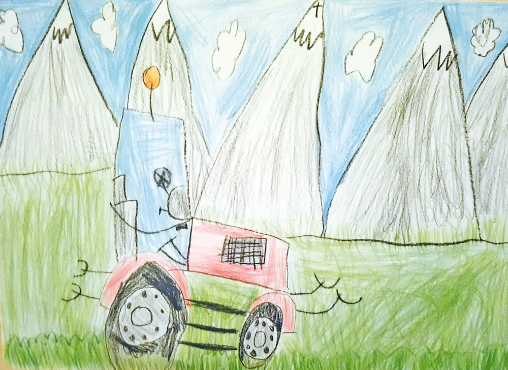 Elina (7 Jahre) aus Lich hat dieses wunderbare Bild für die Kinderseite gemalt. Elina träumt von einem Urlaub mit ihrem Papa und seinem Massey Ferguson in den Bergen.