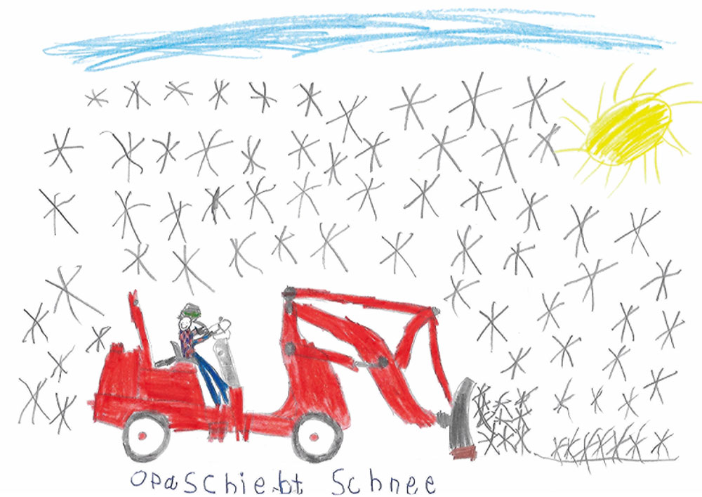 Felix (6 Jahre) aus Mücke, Ortsteil Ober-Ohmen, hat dieses tolle Kunstwerk für die Kinderseite gemalt. Es zeigt seinen Opa beim Schneeschieben mit dem Hoftrac.
