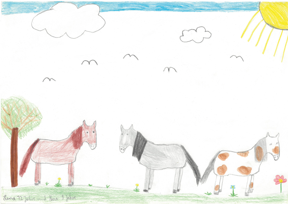Drei prächtige Pferde stehen hier auf einer Weide und lassen sich das saftige grüne Gras schmecken. Lena (12 Jahre) und Nina (9 Jahre) aus Böhl-Iggelheim haben gemeinsam dieses schöne Bild für die Kinderseite gemalt.