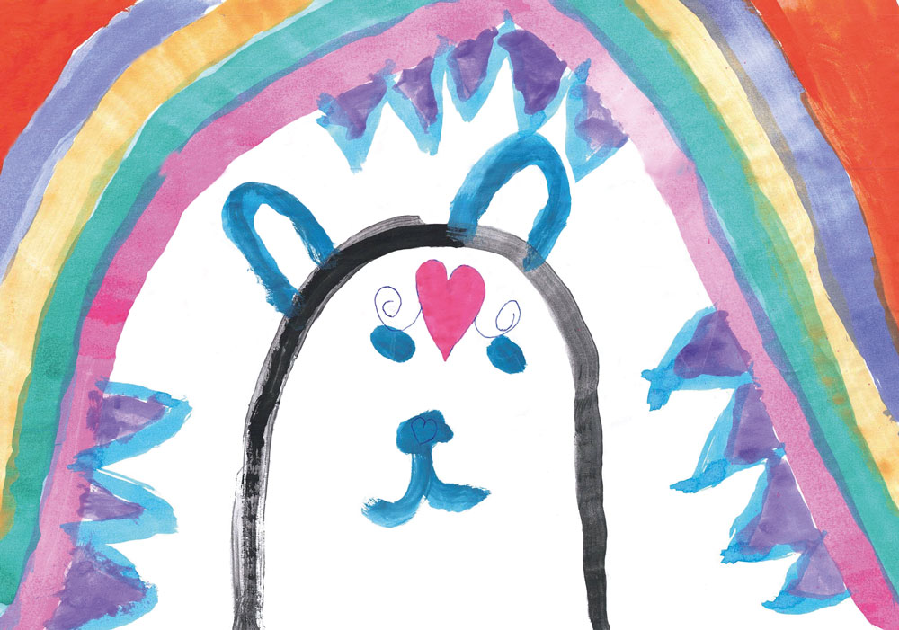 Dieses Bild ist wie ein Blick ins Märchenland. Ihr seht darauf einen Regenbogen mit vielen bunten Farben, unter dem ein niedlicher kleiner Bär steht. Mathilda (6 Jahre) aus Welgesheim hat das wunderbare Bild gemalt.