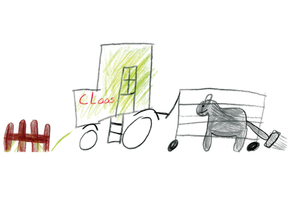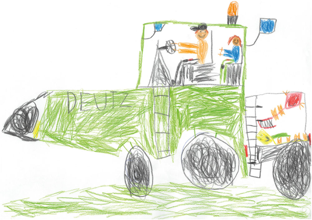 Veit (8 Jahre) aus Nidderau-Ostheim hat dieses tolle Bild gemalt. Es zeigt seine Oma Christina in ihrem Fendt. Im Anhänger transportiert sie eine Menge Tiere: ein Schwein, ein Alpaka und sogar Vögel und Insekten.