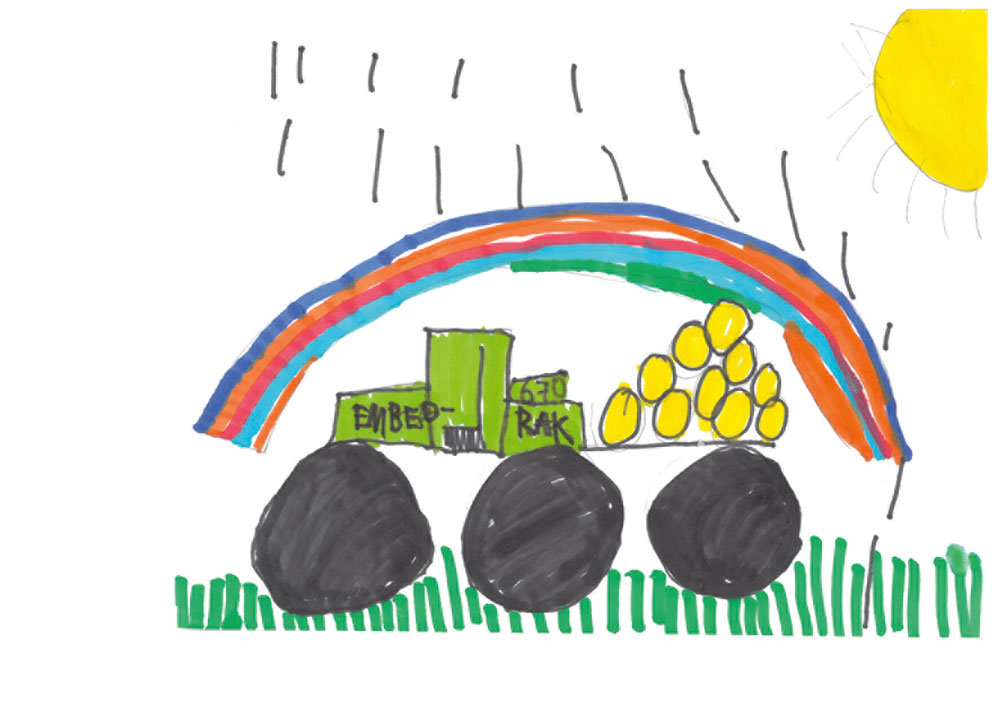 Benedikt (7 Jahre) aus Dautphetal-Herzhausen hat diesen tollen Traktor gemalt, der mit einem Anhänger voller Rundballen unter einem Regenbogen hindurchfährt.
