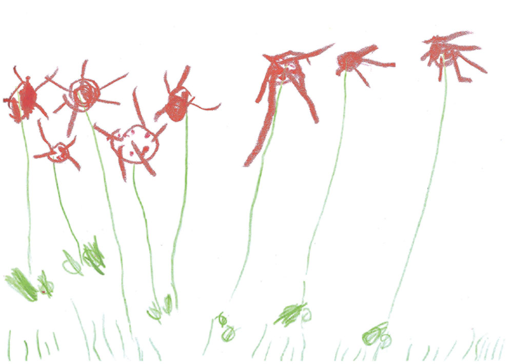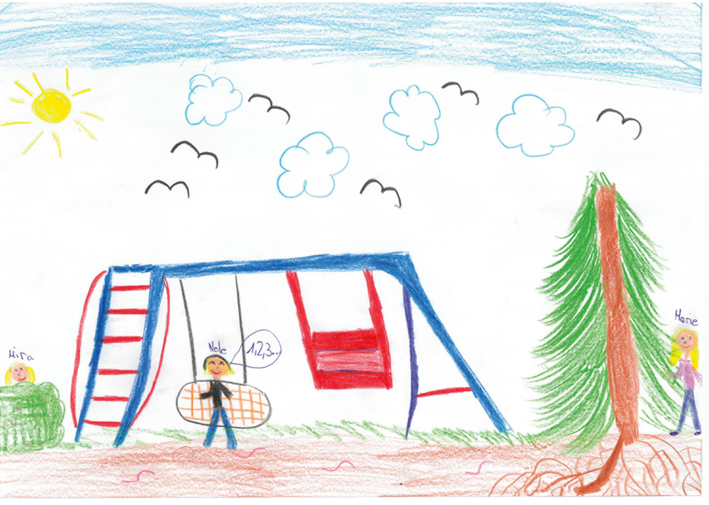 Marie (9 Jahre) aus Hauptschwenda hat dieses wunderbare Bild gemalt. Cousine Nele (10 Jahre) sitzt auf der Schaukel und zählt bis 10. Marie (rechts) und Schwester Mira (6 Jahre) verstecken sich.