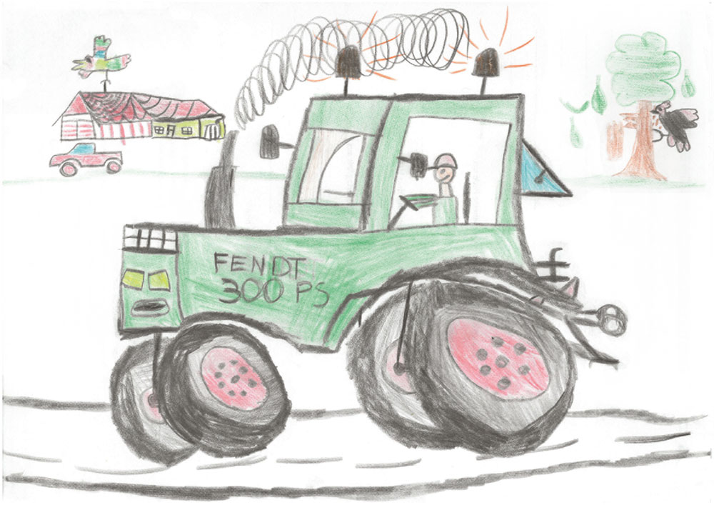 Hier sind zwei Landwirte mit ihrem Kubota-Traktor bei der Arbeit zu sehen. Tim (6 Jahre) aus Diemelsee-Schweinsbühl hat dieses wunderbare Bild gemalt.