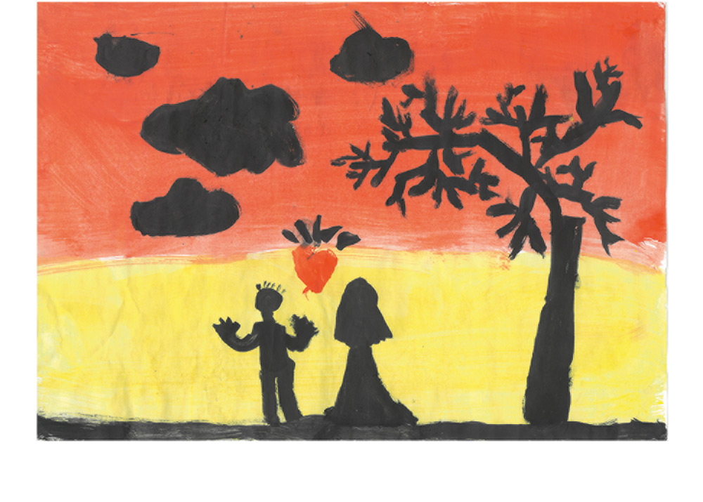 Mit ganz tollen Farben hat Marie (8 Jahre) aus Neukirchen-Hauptschwenda dieses schöne Bild gemalt. Es zeigt einen Mann und eine Frau, die sich einen Sonnenuntergang ansehen.