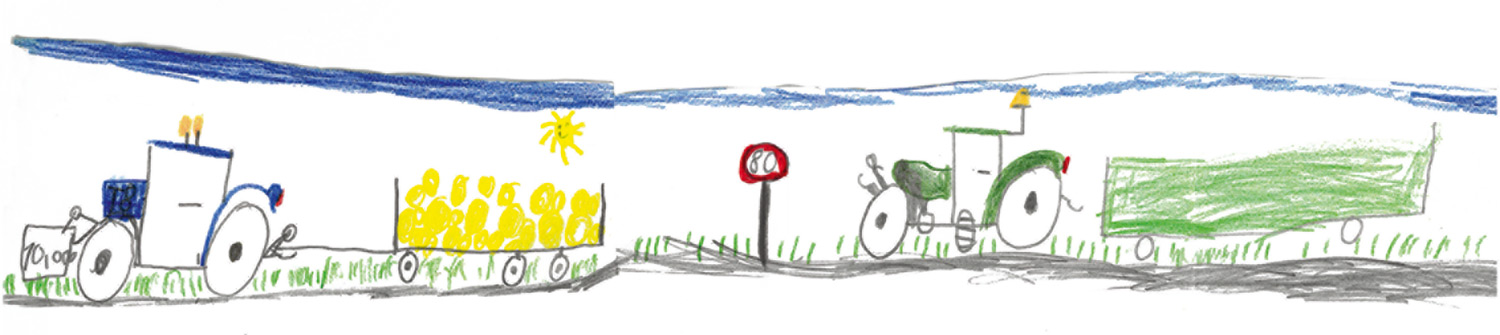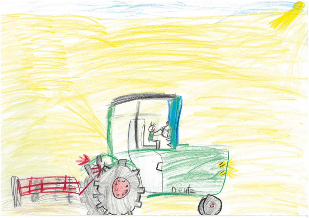 Dieses wunderbare Bild hat Charlotte (4 Jahre) aus Ilbeshausen gemalt. Es zeigt, wie ihr Opa Rundballen mit dem Traktor zum Hof transportiert.