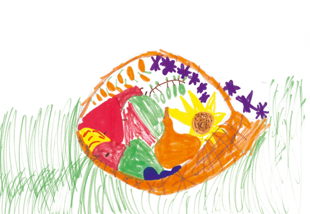 Diesen wundervollen Korb mit Früchten hat Maxima (5 Jahre) aus Wallertheim gemalt. Sie hat das Erntedank-Titelbild der Ausgabe