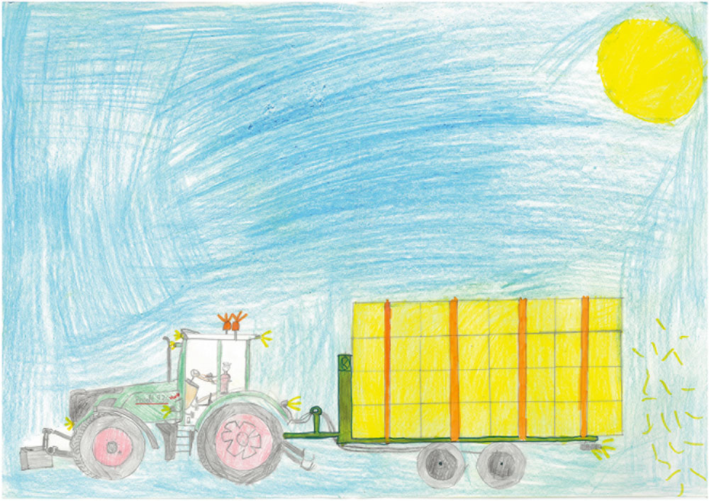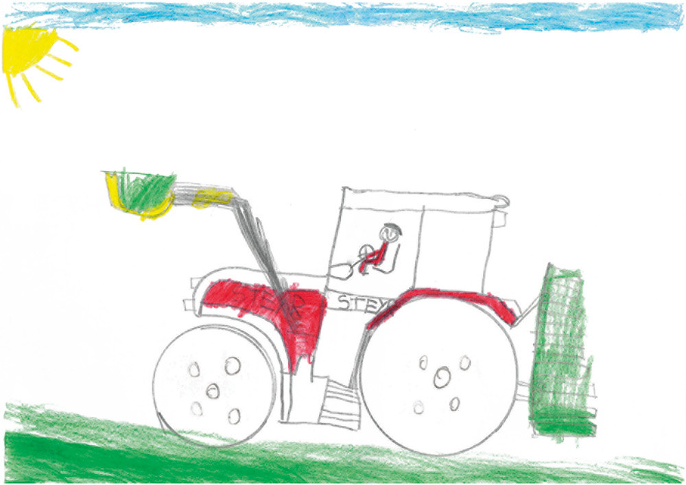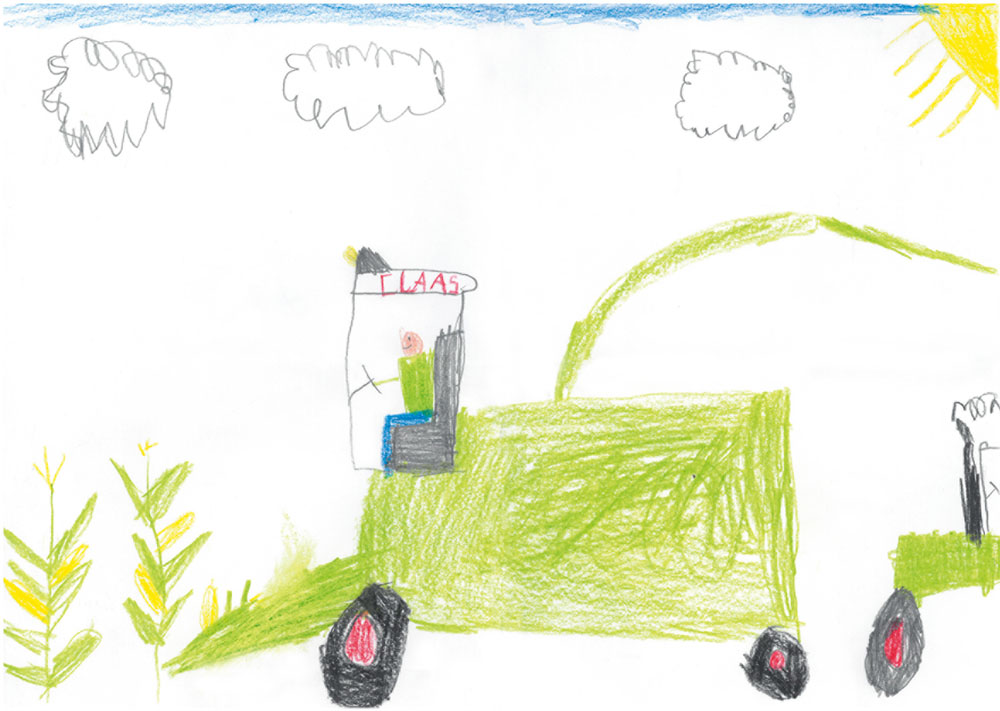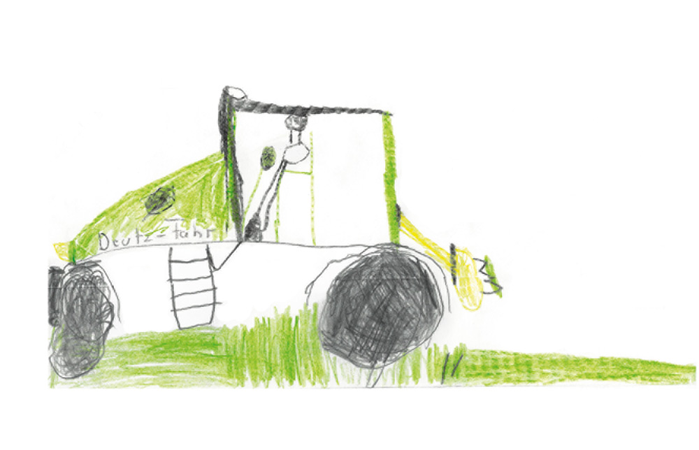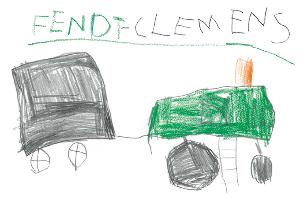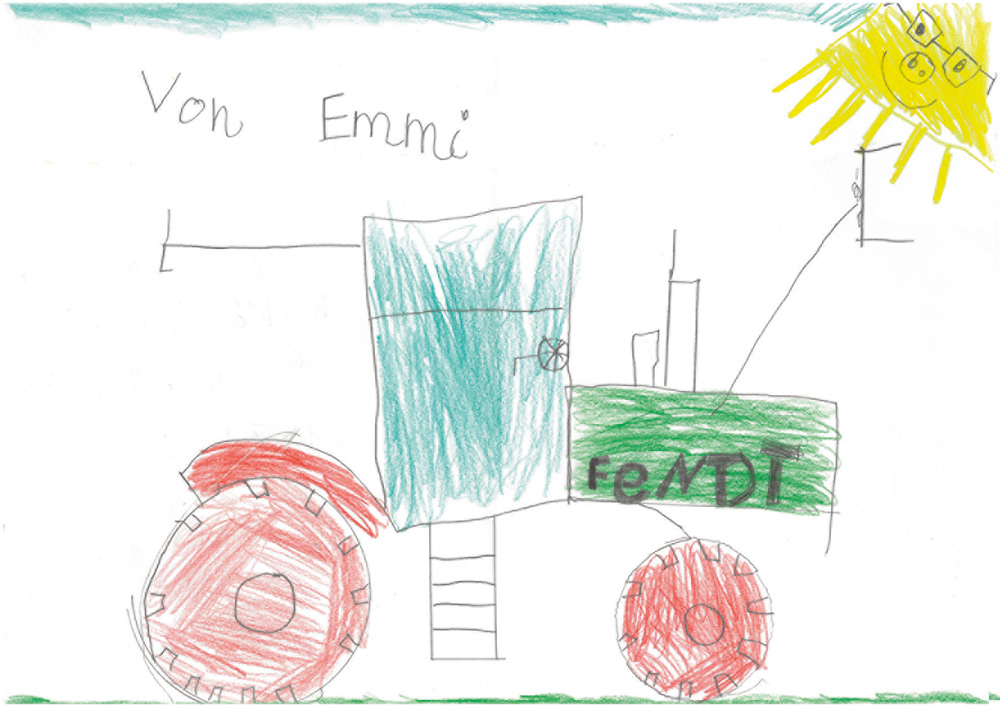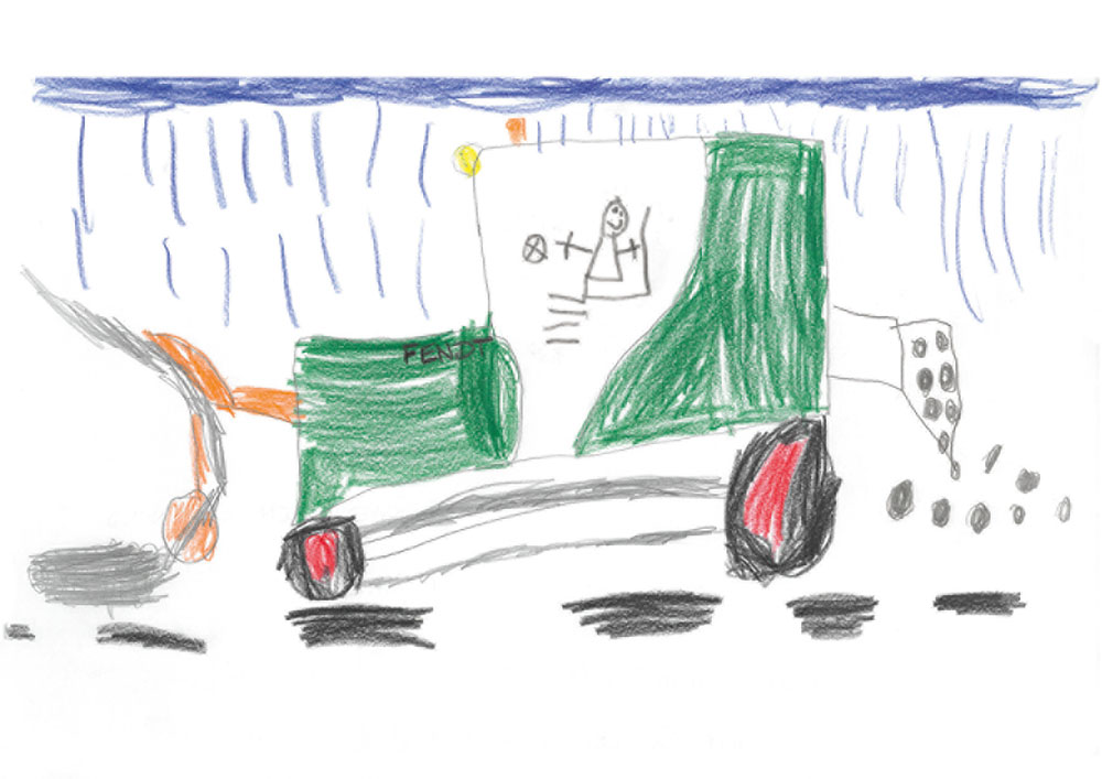 Ganz toll gelungen ist auch dieser Traktor von Fendt mit angehängtem Futtermischer. Clemens (4 Jahre) aus Nidderau hat ihn gemalt.