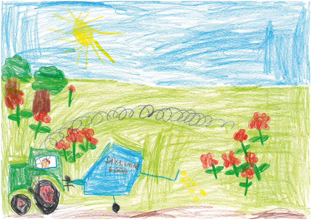 Ganz toll gelungen ist auch dieses schöne Bild von Ben (6 Jahre) aus Ober-Flörsheim. Es zeigt den Traktor von seinem Opa, der über eine Wiese fährt.