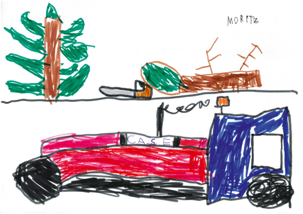 Moritz (6 Jahre) aus Birstein-Mauswinkel hat uns dieses tolle Bild zugeschickt. Im Vordergrund steht ein Traktor von Case. Im Hintergrund seht ihr, wie gerade Bäume gefällt werden.