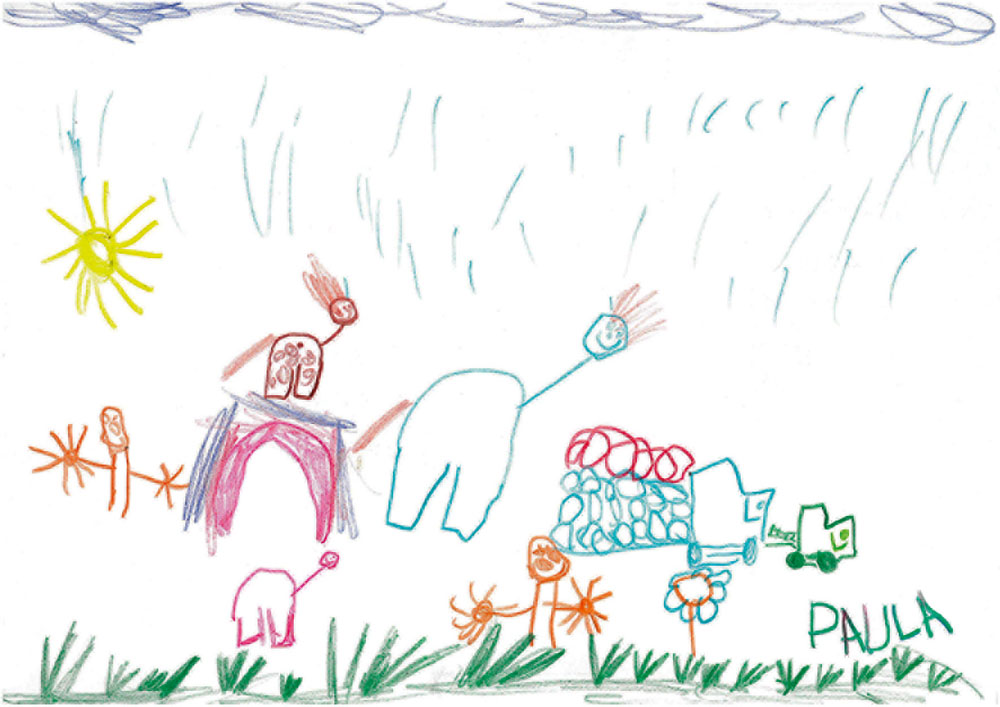Paula (4 Jahre) aus Poppenhausen-Steinwand hat diese herrliche Fantasiewiese mit bunten Pferden, Traktoren, Regenbogen und ganz viel Sonnenschein gemalt.
