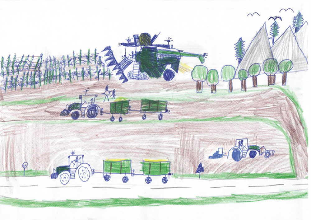 Auf diesem Bild hier seht ihr die Körnermaisernte (hinten) und den Abtransport der Maiskörner mit Traktoren und Anhängern. Vorne rechts im Bild ist die Einsaat von Weizen zu sehen. Philipp (9 Jahre) aus Langenselbold hat dieses tolle Kunstwerk gemalt.