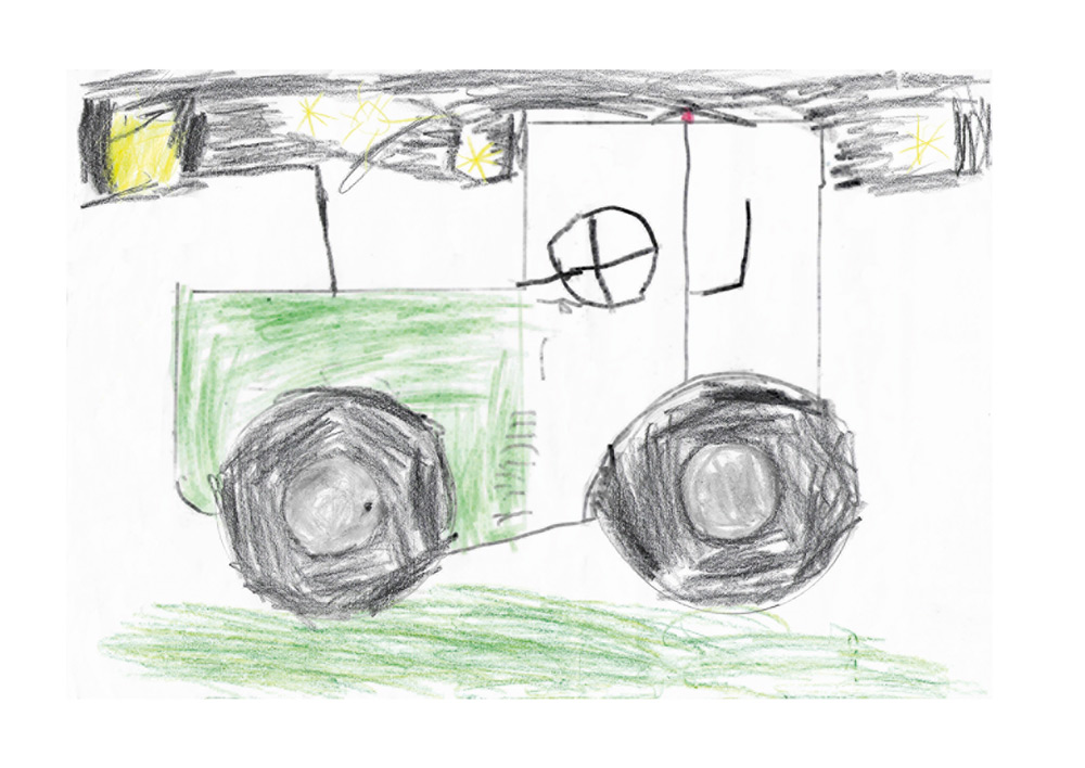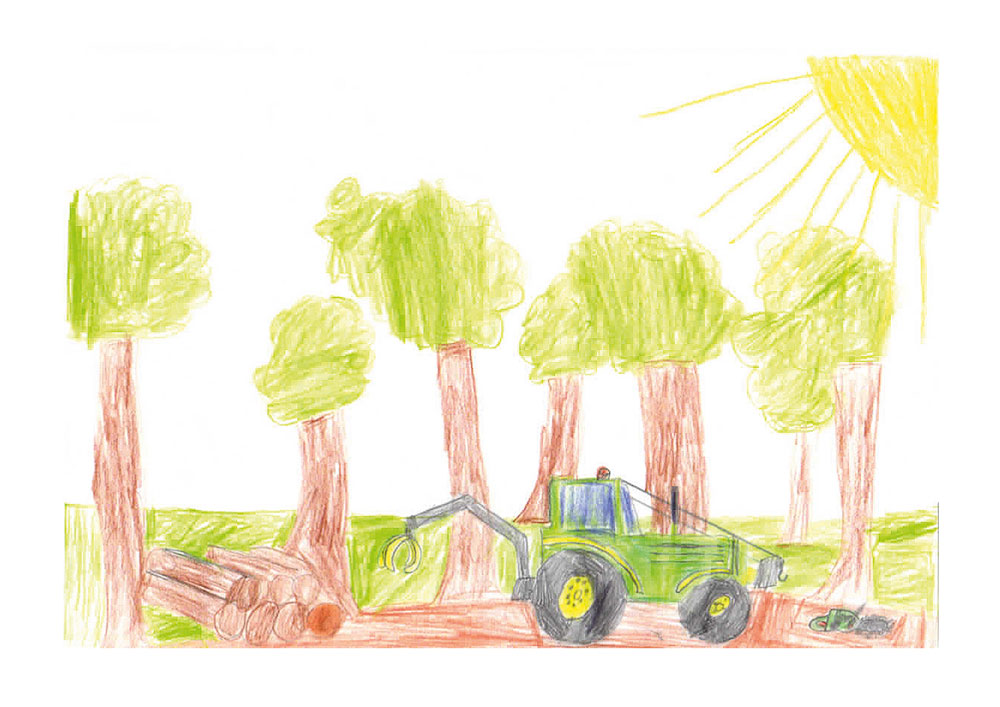 Moritz (8 Jahre) aus Bad Wildungen hat dieses wunderbare Bild gemalt. Es zeigt einen Traktor im Forsteinsatz.