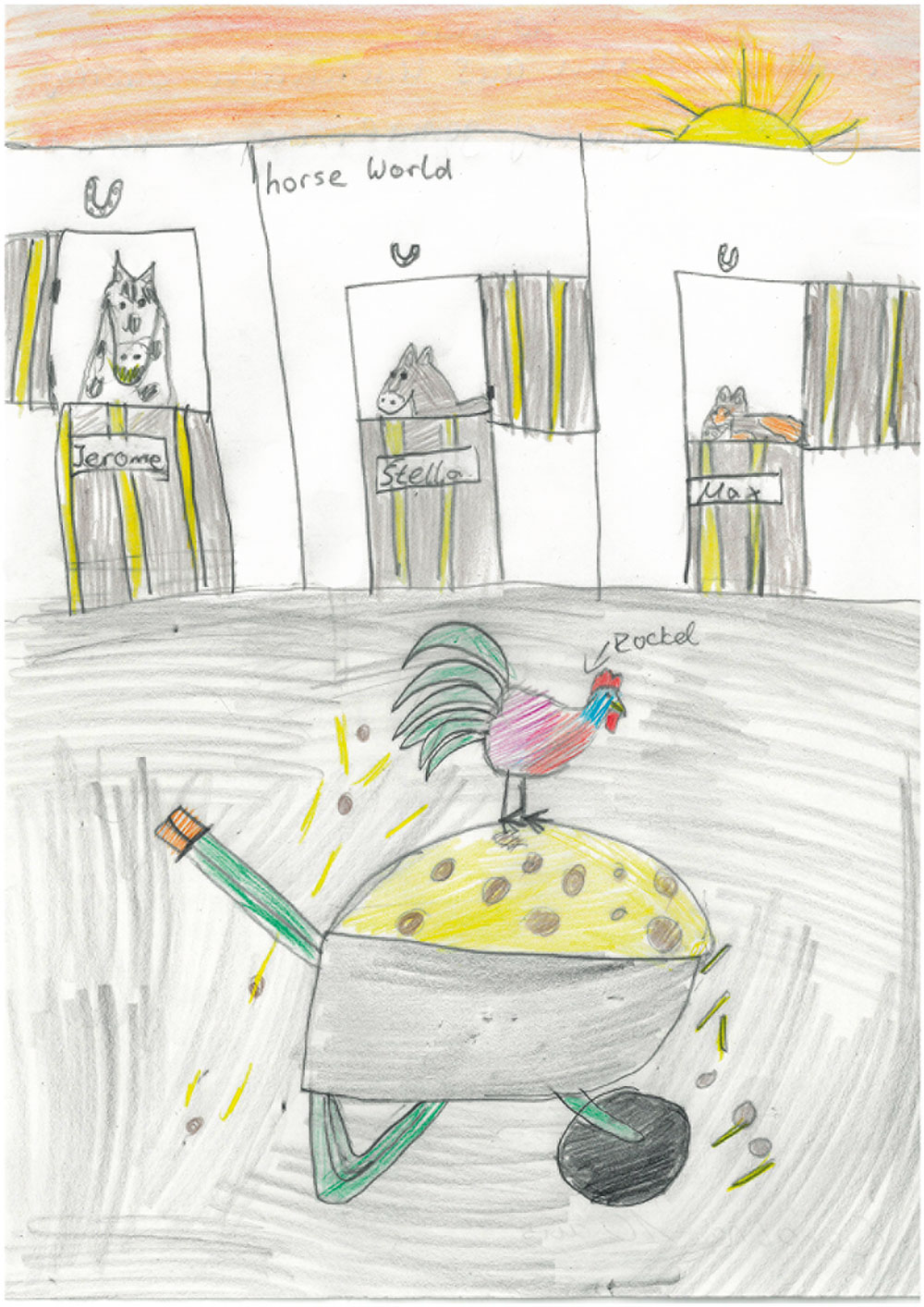Ein herrliches Kunstwerk ist auch dieses Bild von Carolina aus Kirchhain-Emsdorf. Sie reitet gerne. Daher seht ihr hier auf ihrem Bild einen   Pferdehof. In den Boxen stehen die Pferde Jerome, Stella und Max. Niedlich ist auch der Hahn auf der Schubkarre. Carolina ist 10 Jahre alt.