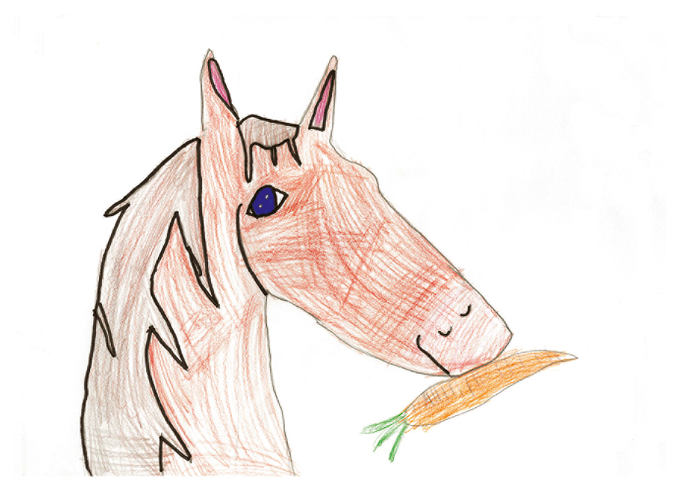 Hier seht ihr Pony Piro eine Karotte fressen. Gemalt hat das wunderbare Bild Lara Angelina (8 Jahre) aus Mücke/Groß-Eichen.