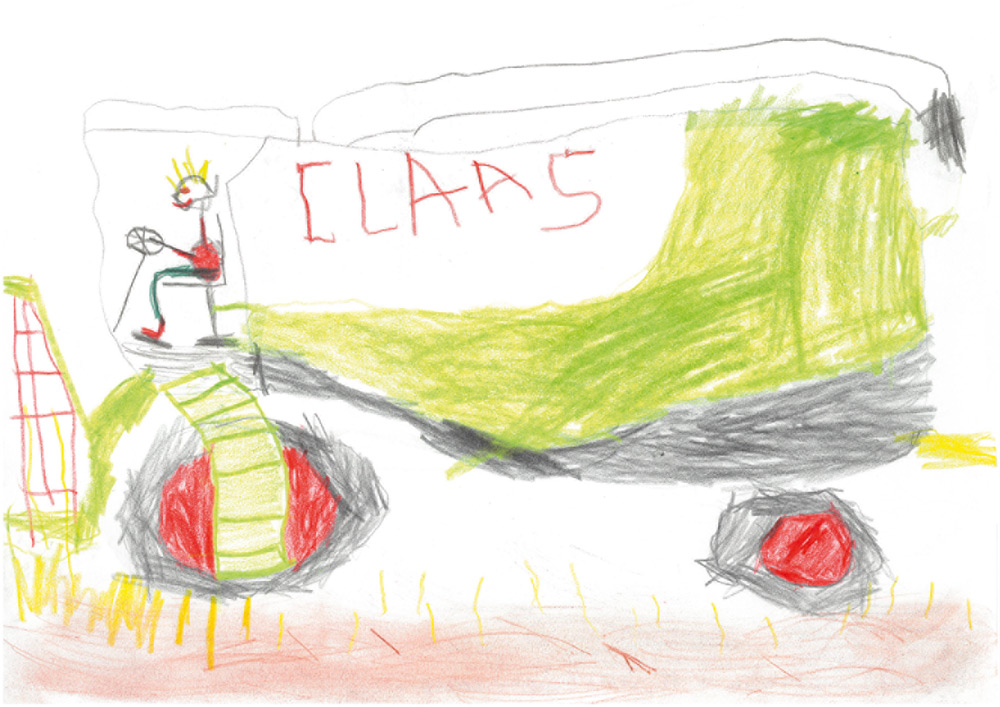5 Jahre alt) aus Schlüchtern-Niederzell hat uns dieses tolle Bild zugeschickt. Linus hat sich selbst gemalt, wie er am Steuer eines Mähdreschers sitzt und zu seinem Opa fährt.