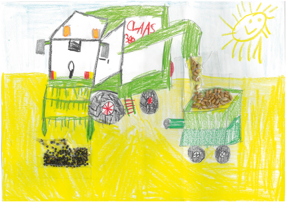 Samuel (7 Jahre) aus Beselich-Schupbach hat diesen wunderbaren Mähdrescher gemalt. Den Raps und die Weizenkörner, die geerntet wurden, hat er kunstvoll aufgeklebt.