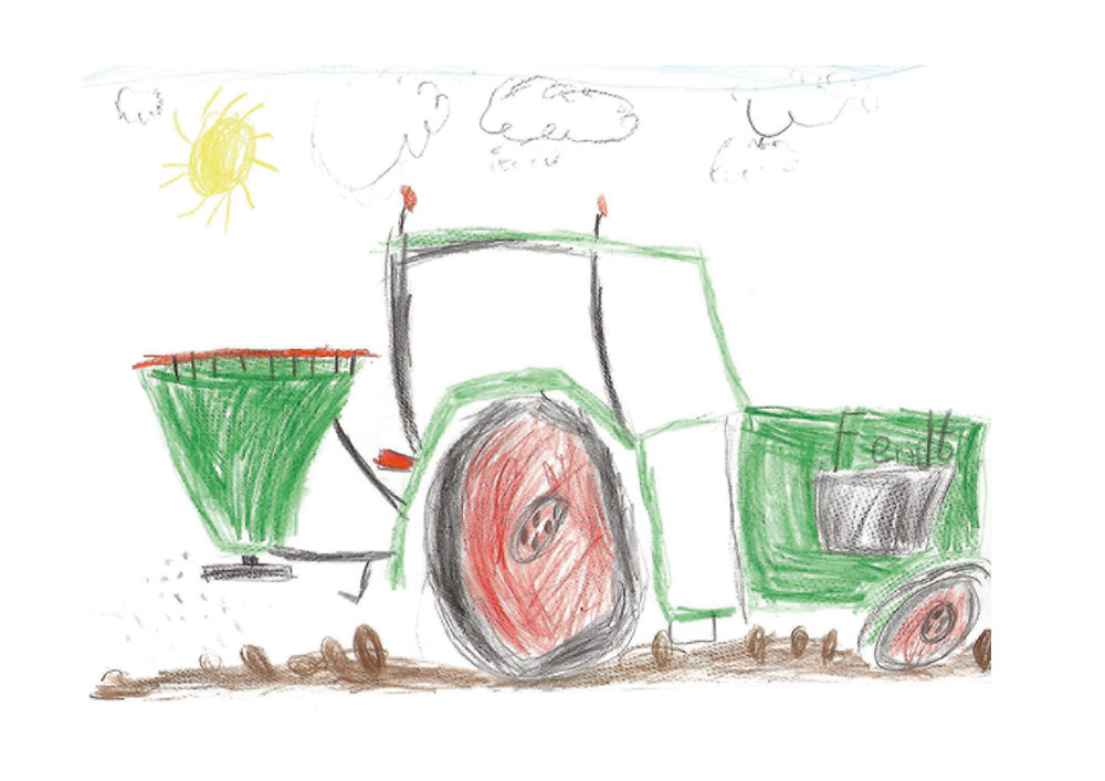 Ganz toll gelungen ist dieses Bild von Kilian (6 Jahre) aus Fulda. Er hat einen Fendt mit angehängtem Düngerstreuer gemalt.