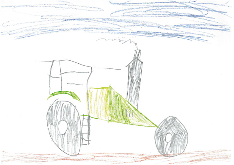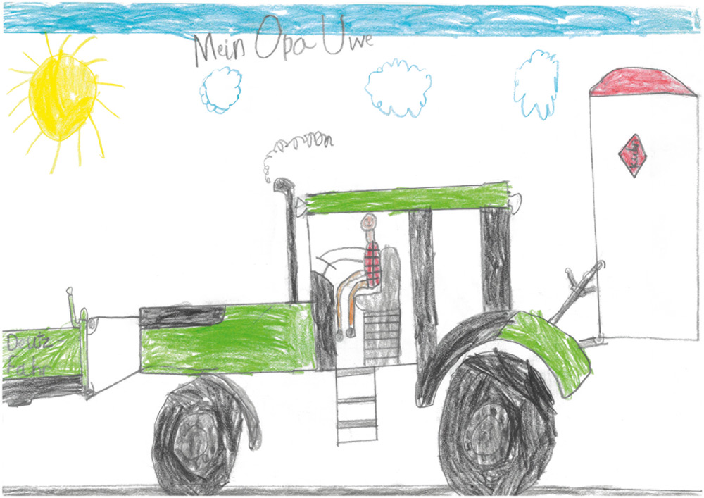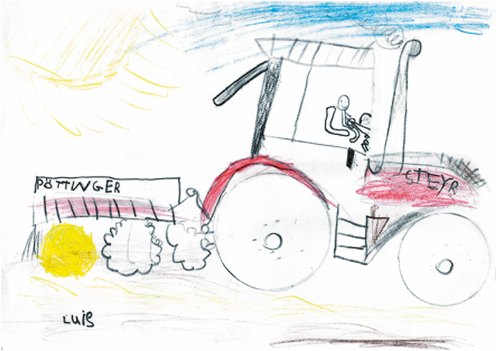 Ganz wunderbar gelungen ist auch dieses schöne Bild. Ihr seht da­rauf einen AgroXtra von Deutz. Franz (6 Jahre) aus Seidenroth hat es gemalt.
