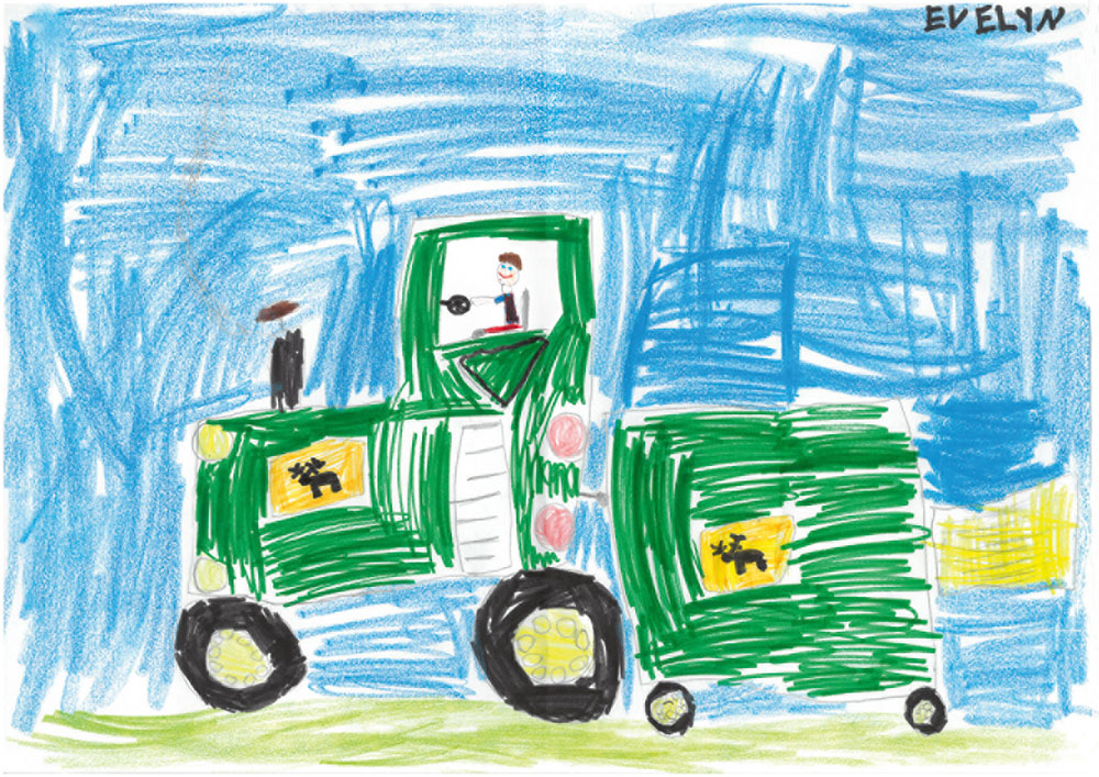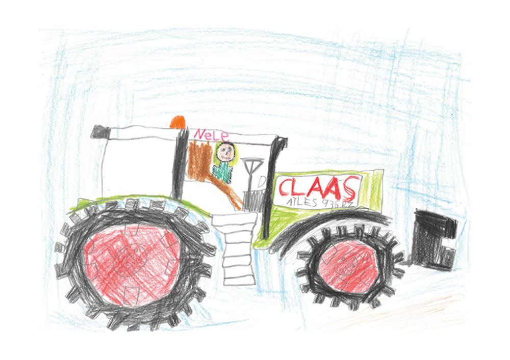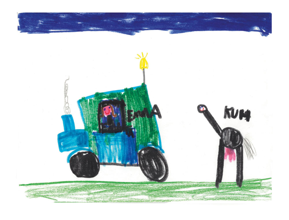 Dieses tolle Bild hat Emma (6 Jahre) aus Ebersburg gemalt. Es zeigt, wie Emma im Traktor gerade nach den Kühen auf der Weide sieht.