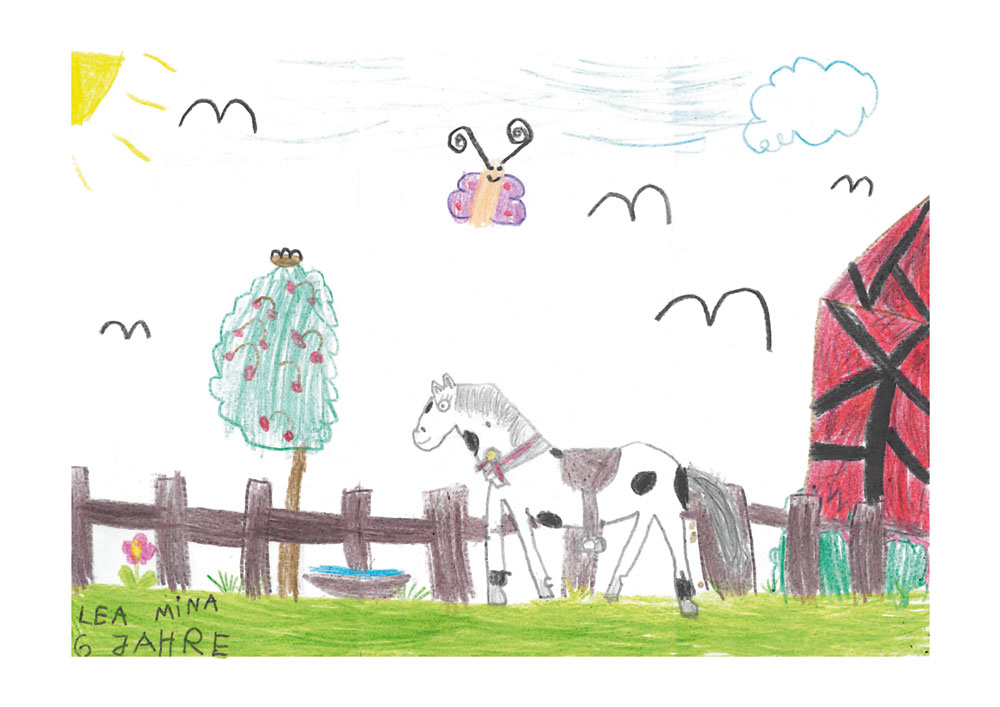 Das Pferd Nero genießt einen herrlichen Tag im Garten. Am rechten Bildrand seht ihr eine schöne Fachwerkscheune. Lea (6 Jahre) aus Allendorf-Battenfeld hat das tolle Bild gemalt.