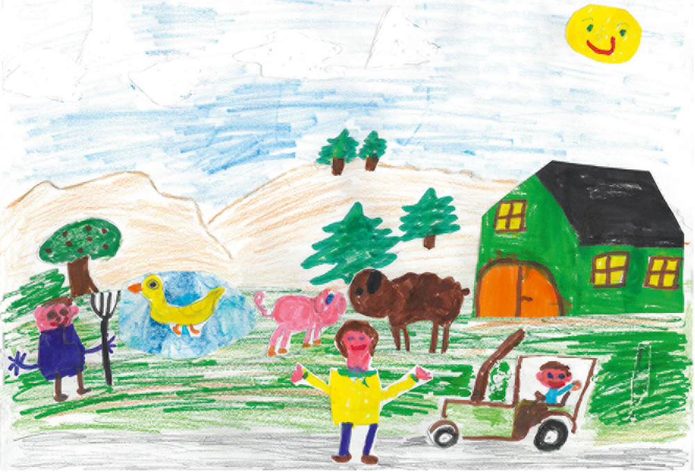 Dieses wunderbare Bauernhofbild mit vielen Tieren und Landwirtsfamilie hat Franziska (5 Jahre) aus Vöhl-Buchenberg gemalt.