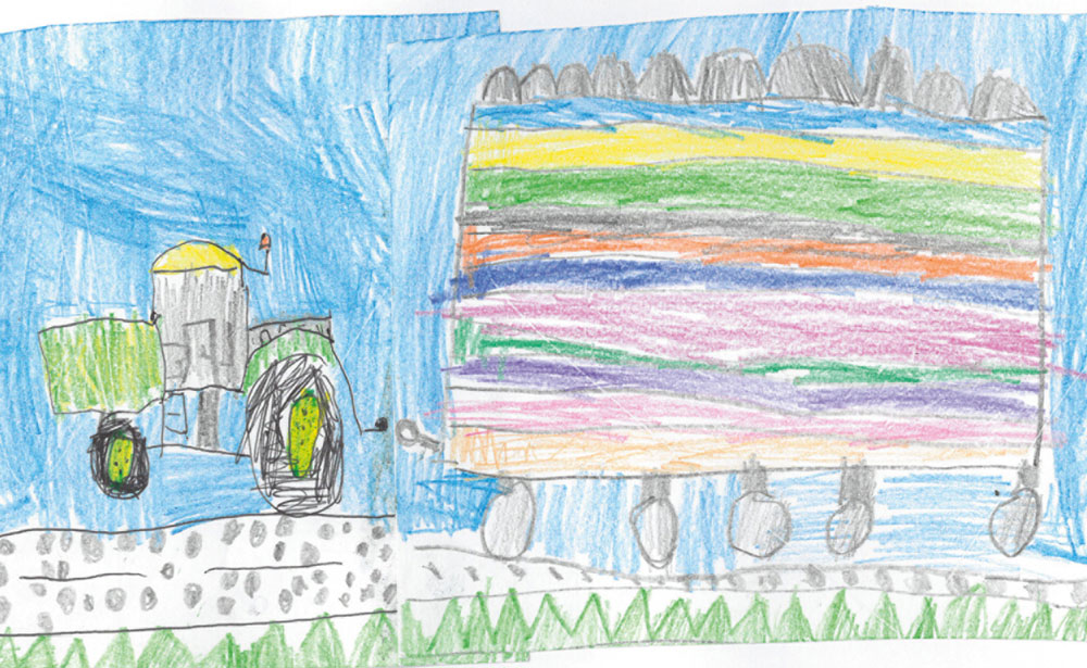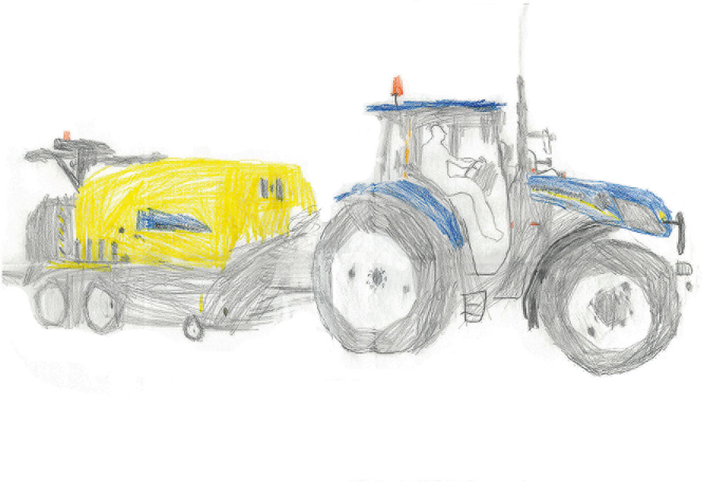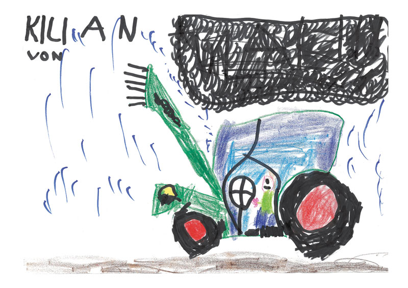 Kilian (5 Jahre) aus Künzell-Wissels hat dieses tolle Bild gemalt. Es zeigt seinen Opa Hermann bei der Arbeit  mit dem Fendt-Traktor.