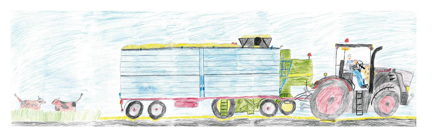 Von Jakob (10 Jahre) aus Schenklengsfeld-Oberlengsfeld erhielten wir dieses tolle Kunstwerk. Es zeigt seinen Freund Karli und ihn selbst mit einem Fendt 828 Vario und einem Dreiachsanhänger von Kögel. Die beiden haben Getreide geladen. Im Hintergrund sieht man einen Mähdrescher T 670i von John Deere.