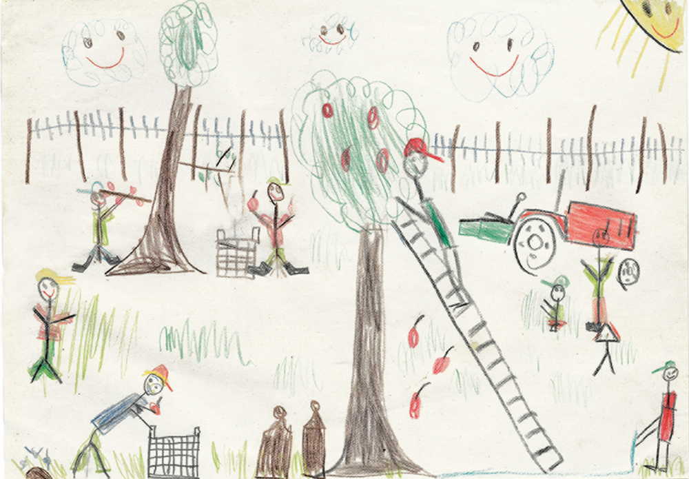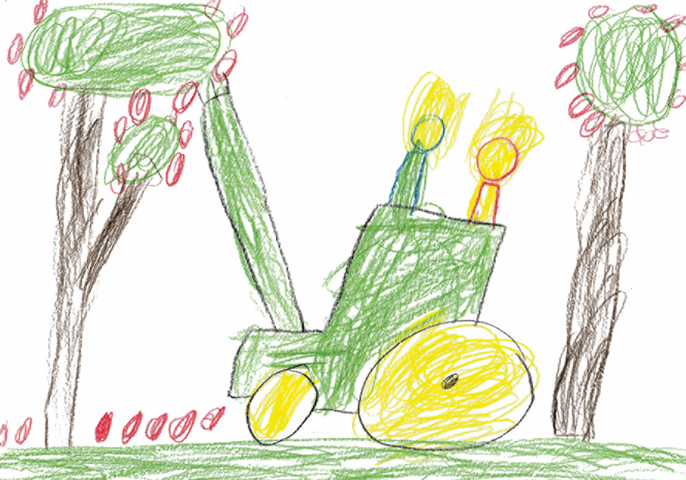 Sehr gefallen hat uns auch dieses schöne Bild von Jonas (6 Jahre) aus Gilserberg-Sebbeterode. Es zeigt die Apfelernte mit einem Traktor von John Deere.