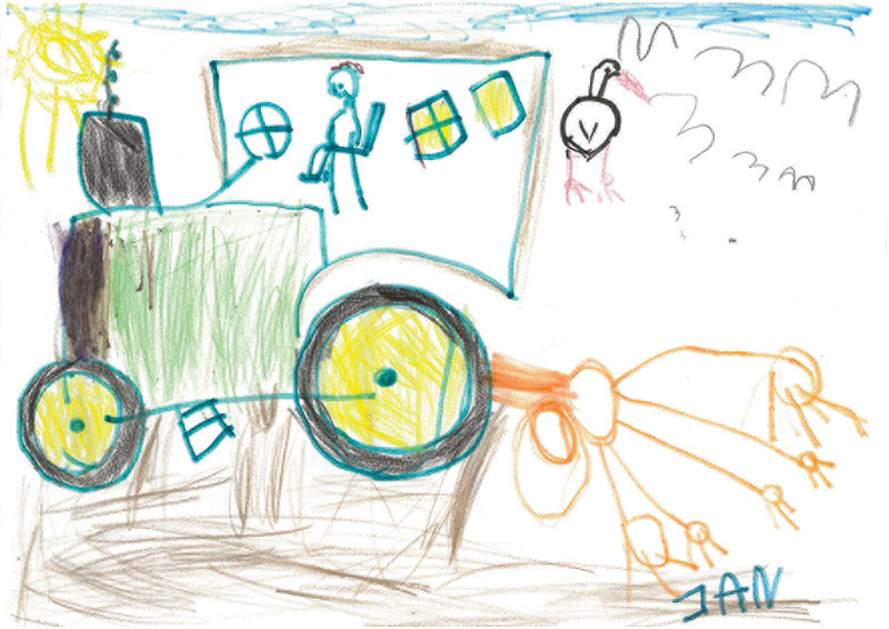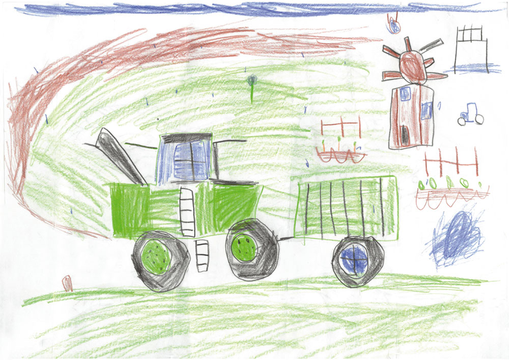 Auf diesem Bild seht ihr einen Landwirt in seinem Traktor beim Bestellen des Feldes. Gemalt hat das tolle Kunstwerk Jan (5 Jahre) aus Böhl-Iggelheim.