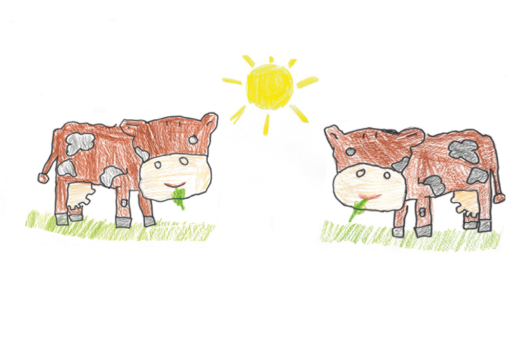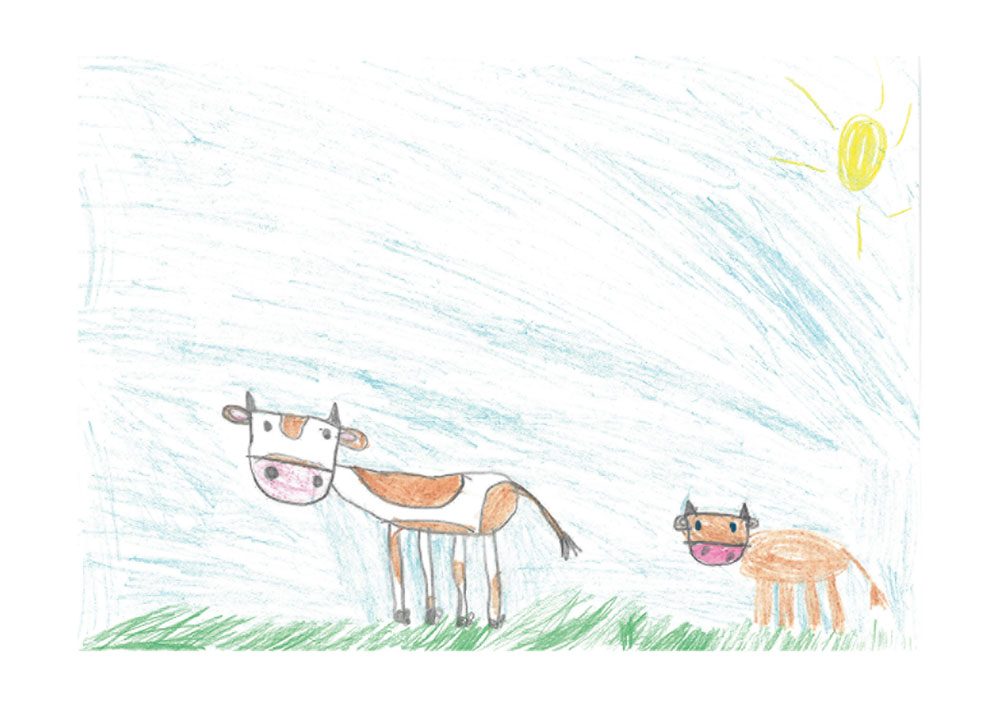 Ganz wunderbar gelungen ist dieses Bild. Es zeigt eine Kuh, die mit ihrem Kalb auf der Weide steht. Gemalt hat es Marie (7 Jahre) aus Neukirchen-Hauptschwenda.