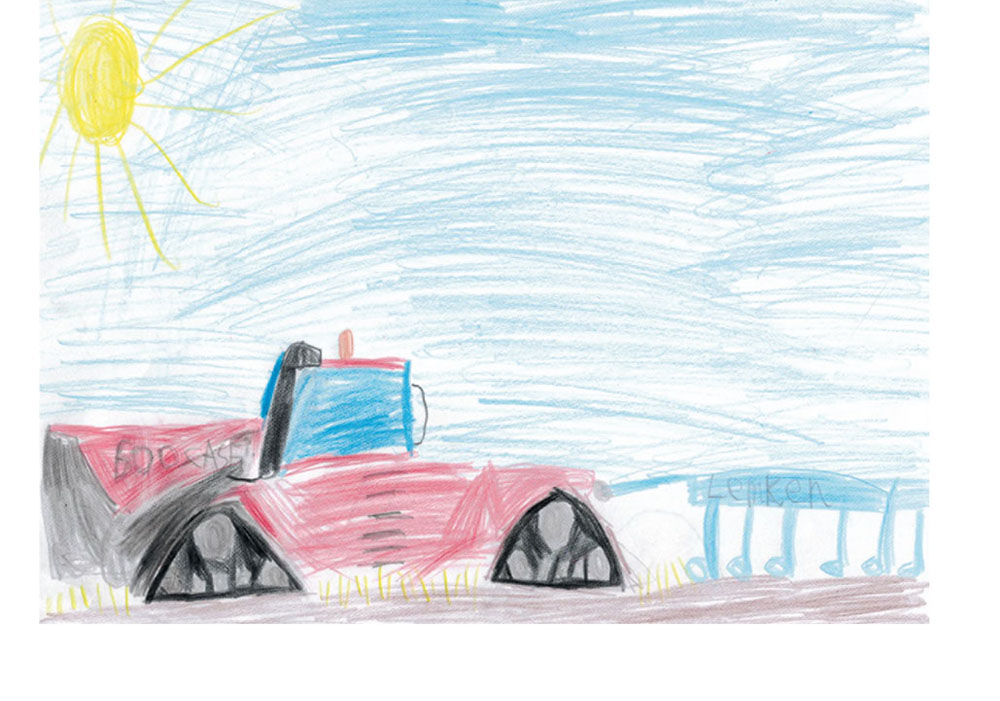 Ganz toll gelungen ist auch dieses Bild. Es zeigt eine Case-Raupe mit einem Grubber von Lemken. Gemalt hat es Hendrik (7 Jahre) aus Neukirchen-