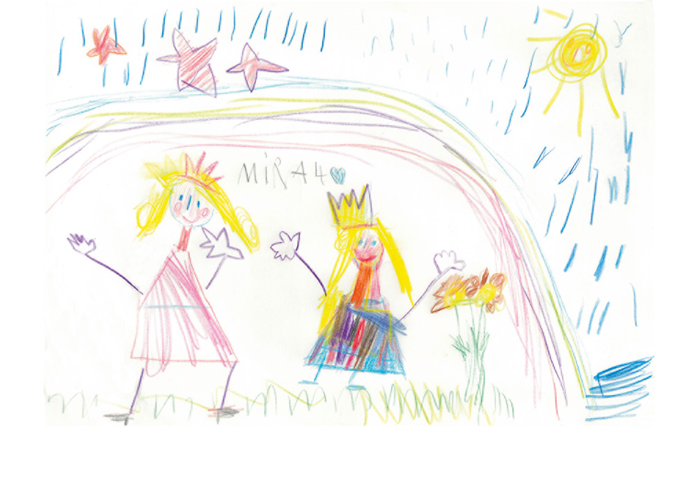 Mira (4 Jahre) aus Neukirchen-Hauptschwenda hat dieses zauberhafte Bild gemalt. Ihr seht darauf zwei Prinzessinnen unter einem Regenbogen stehen.