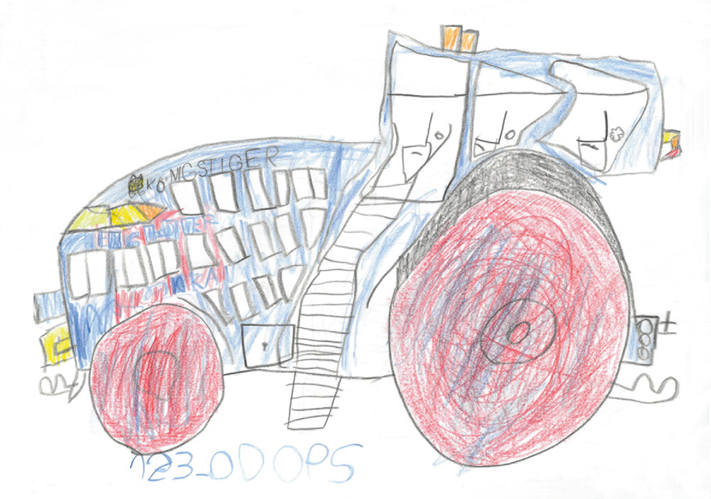 Mika (6 Jahre) aus Herrenberg besucht gerne seine Großeltern auf deren Bauernhof in Bad Zwesten. Besonders begeistert ist er vom Eicher-Traktor seines Opas, den ihr hier auf seinem tollen Kunstwerk bewundern könnt.