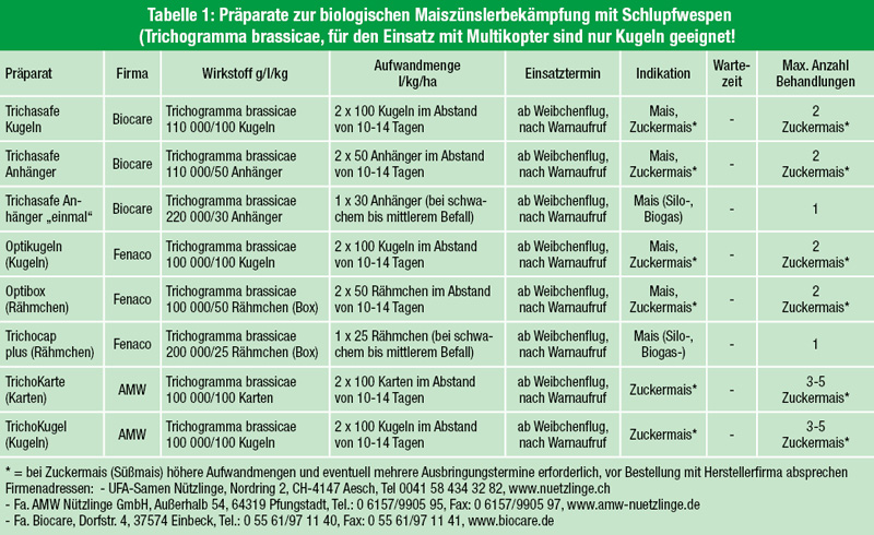 LenzBei Trichogramma handelt es sich um Schlupfwespen, die natürliche Gegenspieler verschiedener Schadschmetterlinge sind. Die winzigen Nützlinge werden speziell gezüchtet und begeben sich in mehreren Schlupfwellen auf die Suche nach Maiszünslereigelegen. Sie laufen die Maispflanzen ab und parasitieren die Eigelege des Maiszünslers. Sie legen ihre eigenen Eier in die des Maiszünslers. Dann schlüpfen daraus neue Trichogrammen, die sich erneut auf die Suche nach neuen Eigelegen machen. Auf dem Markt gibt es drei Firmen, die verschiedene Ausbringungsverfahren anbieten. Die Firmen AMW aus Pfungstadt, Biocare aus Einbeck und Fenaco-Ufa Samen aus der Schweiz. Entweder als Kugeln zum Werfen oder als Kärtchen/Anhänger/Boxen aus Pappe zum Einhängen an die Pflanze. Je nach Ausbringungsform müssen 100 Kugeln/ha oder 25 bis 50 Kärtchen/ha ausgebracht werden. Bei jedem Verfahren ist gewährleistet, dass sich pro Hektar mindestens 100 000 Schlupfwespen befinden. Für eine einmalige Ausbringung, insbesondere bei schwächerem bis mittlerem Befall, bevorzugt in Silo-/Biogasmais gibt es Angebote mit 200 000 Tieren/ha.