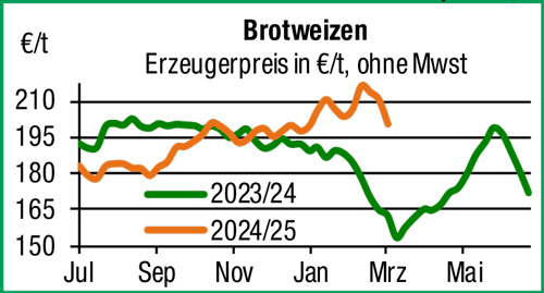 | Getreide und Ölsaaten | Angekündigte US-Handelszölle erzeugen Preisdruck an den internationalen Börsen. Die Offerten regionaler Erfasser sind in der Folge entsprechend rückläufig. Vor allem Brot- und Futtergetreide der alten Ernte stehen unter Druck, Kontrakte für die neue Ernte vergleichsweise stabil bewertet. Braugerste auf schwacher Basis behauptend, bei Offerten um 230 €/t konnten zuletzt regional größere Mengen der neuen Ernte in die Bücher genommen werden. Raps nur knapp behauptend, an den Börsen entsteht ebenfalls Druck. Das Hochdruckwetter hat zu einem schnellen Beginn der Frühjahrsbestellung geführt, auf den frühen Standorten sind die Arbeiten weit vorangeschritten. |
