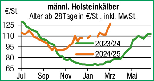 | Nutzkälber | Die Nachfrage am Nutzkälbermarkt bleibt lebhaft, der Abverkauf verläuft stetig und die Einstallbereitschaft der Mäster ist ungebrochen hoch. Altersgerecht entwickelte männliche Tiere und Mastkreuzungen sind gesucht und erzielen teils deutliche Aufpreise. |