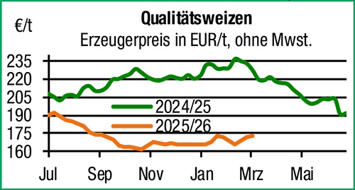 | Getreide und Ölsaaten | Mit dem Wetterumschwung haben nun landesweit die Feldarbeiten begonnen und an den regionalen Landlägern steht das Betriebsmittelgeschäft im Vordergrund. Im Umfeld fester Rohstoffmärkte lassen sich in der laufenden Woche kleinere Aufschläge für Brot- und Futtergetreide verzeichnen. Neugeschäfte beschränken sich jedoch auf den steten Bedarf der Futtermischer. Deutliche Kursgewinne verzeichnet Raps auf allen Terminen, mit den steigenden Rohölpreisen spekulieren Abgeber auf weiter steigende Notierungen, Händler empfehlen das Verkaufen nicht zu vergessen. |