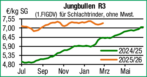 | Schlachtrinder | Der Schlachtrindermarkt zeigt sich weiterhin sehr robust. Trotz Widerstände der Schlachtereien halten die Notierungen ihr historisch hohes Niveau. Im Metzgereigeschäft läuft die Nachfrage verhalten, hier werden erst zu Ostern Impulse erwartet. Jungbullen und Färsen knapp behauptend. Schlachtkühe hingegen weiter knapp und fest bewertet. |