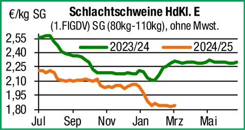 | Schlachtschweine | Der Schlachtschweinemarkt entwickelt sich zunehmend freundlicher, Angebot und Nachfrage gleichen sich weiter an. Im europäischen Fleischmarkt ist die Nachfrage stetig und stabil, aus Osteuropa wird von lebhafter Nachfrage berichtet. An der Schweinebörse konnte eine von drei angebotenen Partien zu einem Durchschnittspreis von 1,75 €/kg SG vermarktet werden. |