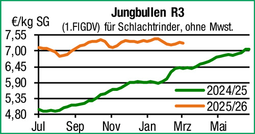 | Schlachtrinder | Der Absatz am Schlachtrindermarkt verläuft für die Jahreszeit fortgesetzt ungewöhnlich flott. Das Erzeugerangebot bleibt für den Bedarf im Metzgereigeschäft in der Regel gut ausreichend und Jungbullen sowie Färsen notieren auf erreichter Basis stabil. Schlachtkühe bei begrenzten Stückzahlen nochmals fester bewertet. |