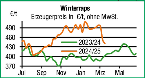 | Getreide und Ölsaaten | Der Handel am regionalen Getreidemarkt verläuft in ruhigen Bahnen, an den Landlägern steht das Betriebsmittelgeschäft im Rahmen der weit vorangeschrittenen Frühjahrsbestellung im Vordergrund. Nachdem sich die Erzeugerpreise für Brot- und Futtergetreide nach der jüngsten Schwäche an den Börsen wieder gefangen haben, müssen aktuell massive Kurseinbrüche für Raps verzeichnet werden. Der Erfassungshandel erwartet keine größeren Positionen 24er Ware mehr, für die neue Ernte bleibt die Vorverkaufsquote derzeit jedoch weiterhin niedriger als sonst üblich. Braugerste bei schwachem Malzgeschäft ohne physisches Geschäft und weiter schwach bewertet. |