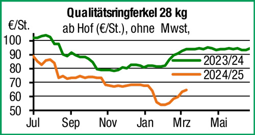 | Schlachtschweine | Am Schlachtschweinemarkt setzen sich freundlichere Tendenzen fort, Angebot und Nachfrage gleichen sich weiter an. Der Status MKS frei wurde für den allergrößten Teil Deutschlands wiedererlangt, so dass sich im Export Märkte wieder öffnen dürften. Zum Frühlingsbeginn wird außerdem mit einer steigenden Nachfrage gerechnet. An der Börse ist aktuell ein verstärktes Interesse mit Abschlüssen oberhalb der VEZG Empfehlung zu beobachten. |